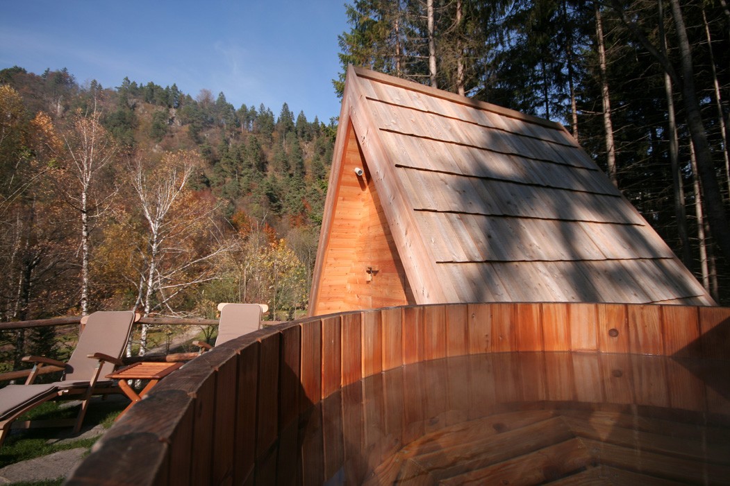 Die bezaubernden kleinen aus Holz gefertigten Campinghäuschen sind die richtige Wahl, wenn Sie zu zweit der Alltagsroutine entfliehen möchten. Das Übernachten in der Natur erhält hier eine ganz neue Bedeutung. Die Häuschen sind aus ökologischem unbehandeltem Lärchenholz gefertigt, und das Dach ist mit Lärchenschindeln eingedeckt. Das komfortable Bett wurde komplett aus natürlichen Materialien gefertigt. Im Häuschen ist ein angenehmer Duft von Holz zu verspüren. Vor dem Häuschen tragen eine gepflegte Umgebung mit für die Alpenregion typischen Pflanzen, einem Holz-Badebottich mit Holzbeheizung sowie mit komfortablen Liegestühlen aus Holz zu Ihrem Wohlbefinden bei.