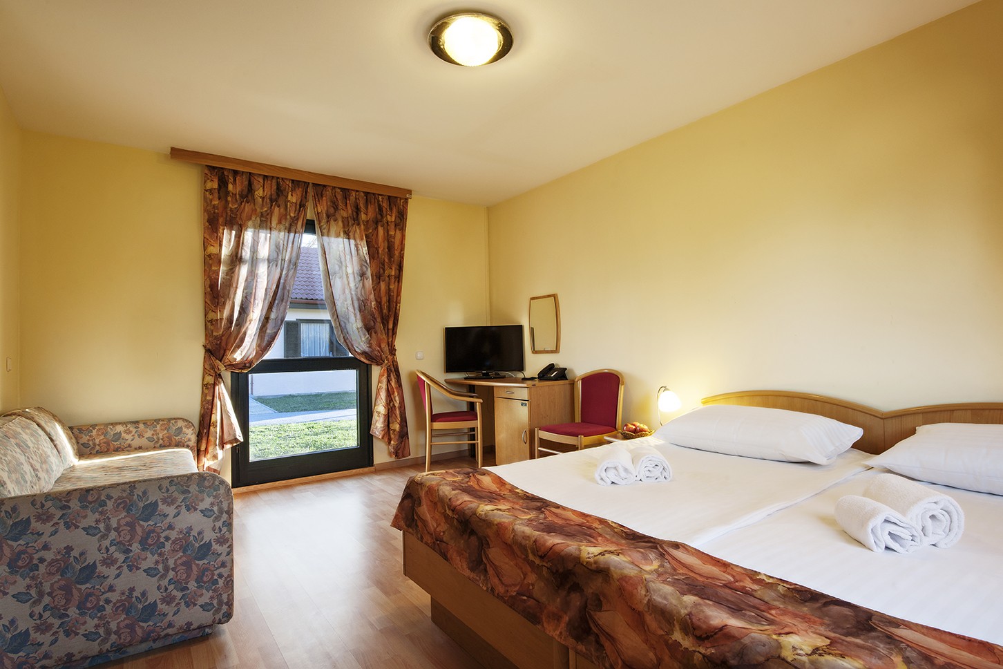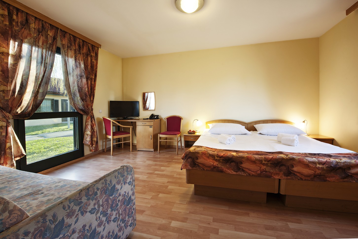 Gemütlicher Bungalow für zwei Personen mit Doppelbett der Größe 180 cm oder zwei getrennten Betten jeweils der Größe 90 cm und mit Parkblick. Im Bungalow mit einer Größe von 28 m2 befindet sich ein Badezimmer mit Dusche und WC, eine Terrasse, ein Schreibtisch und Einsitzer. Zusatzbett auf Anfrage möglich.
