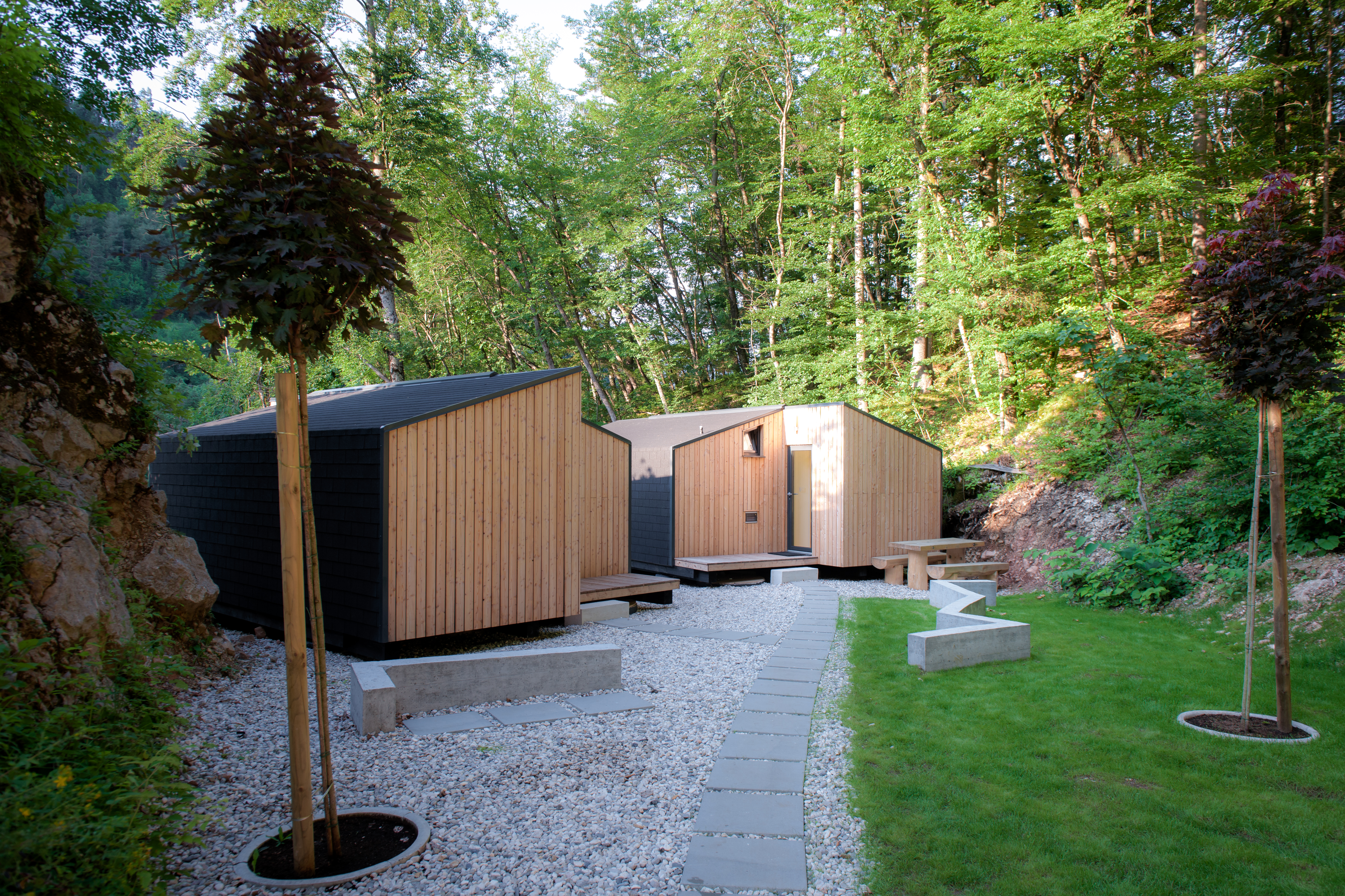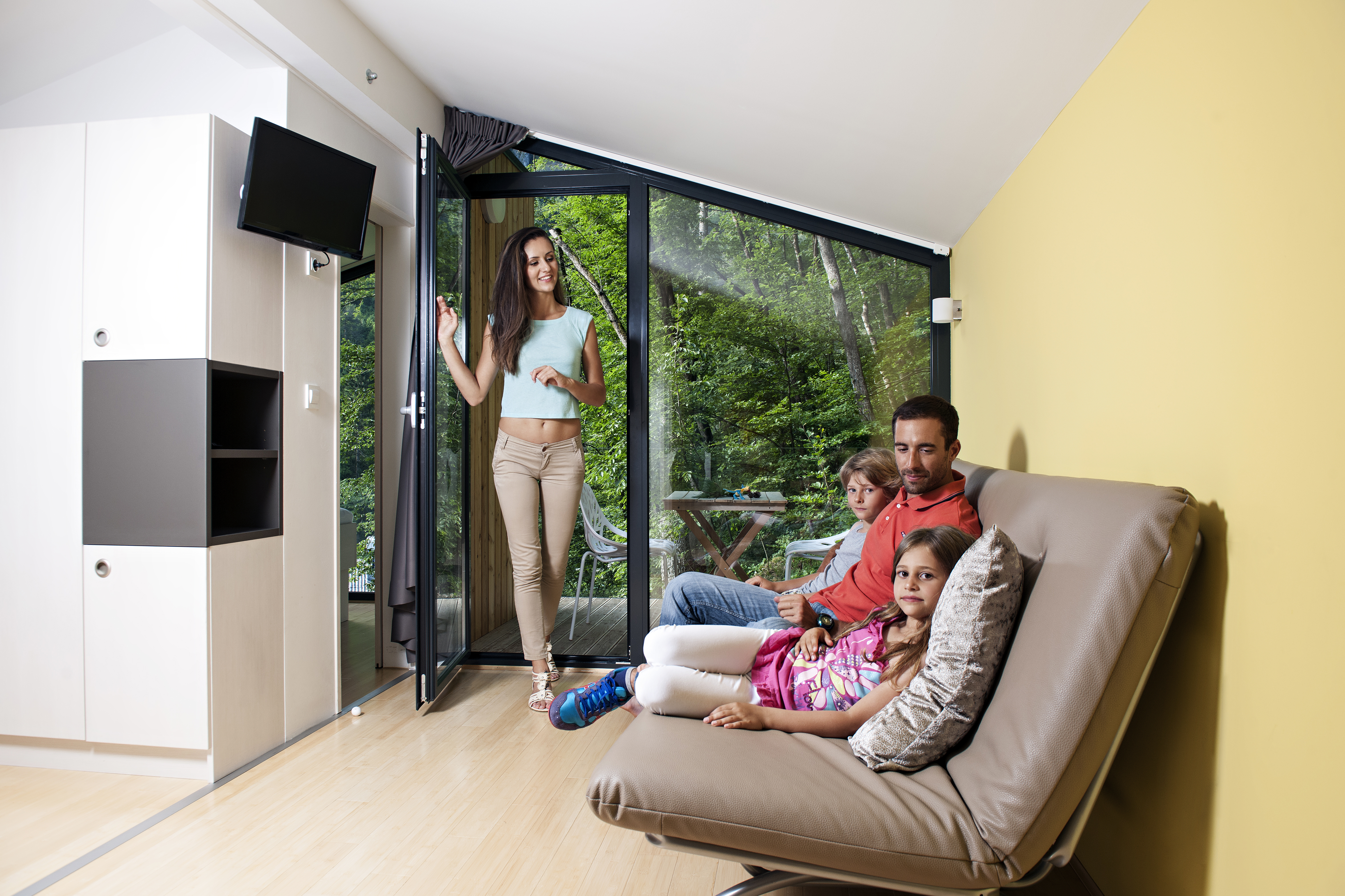Family mobile homes with a contemporary and highly aesthetic design, situated at the edge of the forest, bring joy and happiness to parents and children alike. They are slightly elevated above the surrounding area and offer magnificent views, while providing guests with complete privacy and comfort. The houses are made of wood and natural materials that breathe. A large panoramic window gives a feeling of spaciousness and connection with the surrounding nature. The houses are surrounded by greenery and offer pleasant shade during the summer months, as well as views that are sure to amaze.